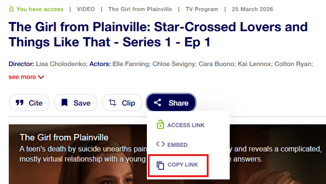 Teachers, librarians, and students can share video content from Explore Media in two ways: using a standard sharing link for unrestricted videos, or an access link for videos that fall outside your school's classification settings.